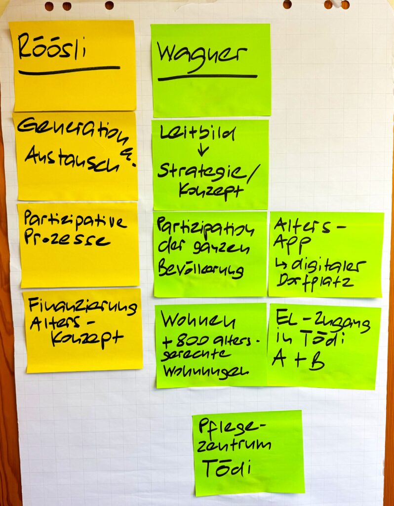 Die Diskussion beleuchtete primär den Horgner Handlungsbedarf: Die fehlende Mitwirkung der Bevölkerung bei der Entwicklung und Steuerung der Alters-Strategie, die fehlende Transparenz über die Daten (Bedürfnisse, Verantwortlichkeiten, Ergebnisse) sowie der akute Mangel an altersgerechtem, bezahlbarem Wohnraum. Der Elefant im Raum war die Blackbox BGZ-Wohnungen Tödi A+B und Pflegezentrum Tödi. Die Umsetzung der Aufträge der Stimmberechtigten ist seit acht Jahren pendent, die Informationslage ist prekär. Dieses Thema soll an einer nächsten Veranstaltung aufgenommen werden.